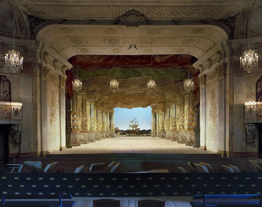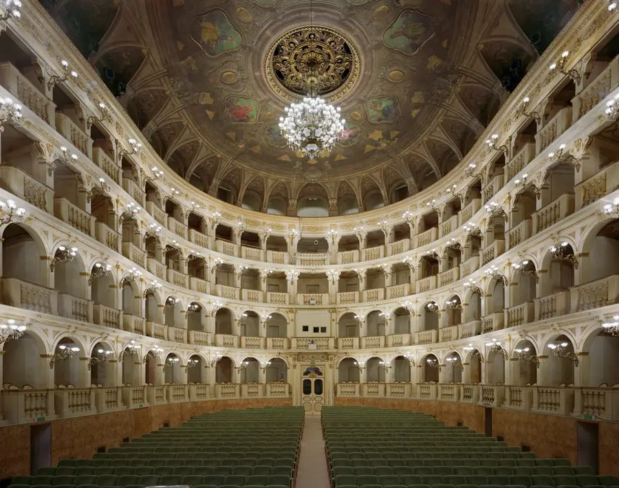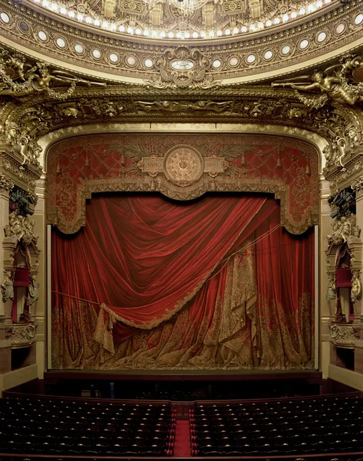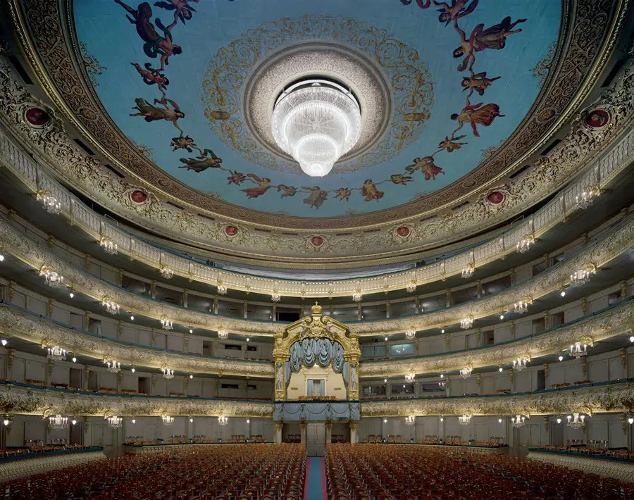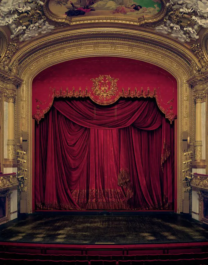 Employing both 4 x 5 and 8 x 10 inch Arca-Swiss cameras that maximize detail, Leventi creates a body of large scale photographs that document the intricate interiors of famous opera houses around the world, such as the Royal Swedish Opera in Stockholm and the Metropolitan Opera in New York. In these dramatic photographs, Leventi seeks to alter both lateral and vertical symmetry in order to flatten out the opera houses. Space, in perfect equilibrium, creates the effect of the viewer being surrounded from the spot at center stage where performers would stand. Rows of velvet seats, ornate private boxes, chandeliers and gilt decorations are captured in incredible detail and symbolize the wealth and grandeur of its respective nation.