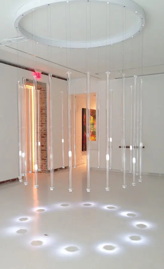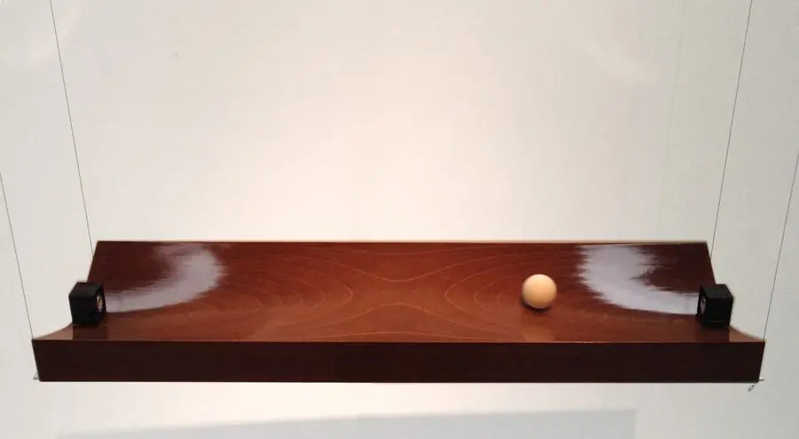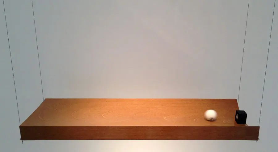 Random Precision in the Metric of Time presents a new body of work that reveals unexpected variances through time-based media and processes. Manifestations of rhythmic arrangements are explored using various media, either through movement or layers of materials accumulated over time. The works in the exhibition are divided into four groups: kinetic sculptures made up of arrangements of vertically suspended glass pipes equipped with Ping-Pong balls, fans and LED lighting; suspended sculptures which utilize different variations of intricately shaped planes; large-scale CNC palimpsest prints and reliefs carved out of laminated layers of thin Masonite. Redl explains that the meticulously engineered works are exposed to uncontrollable parameters, which introduce random errors and distort the unvarying precision of the metric of time, thus allowing time to be experienced as an imperfect system.