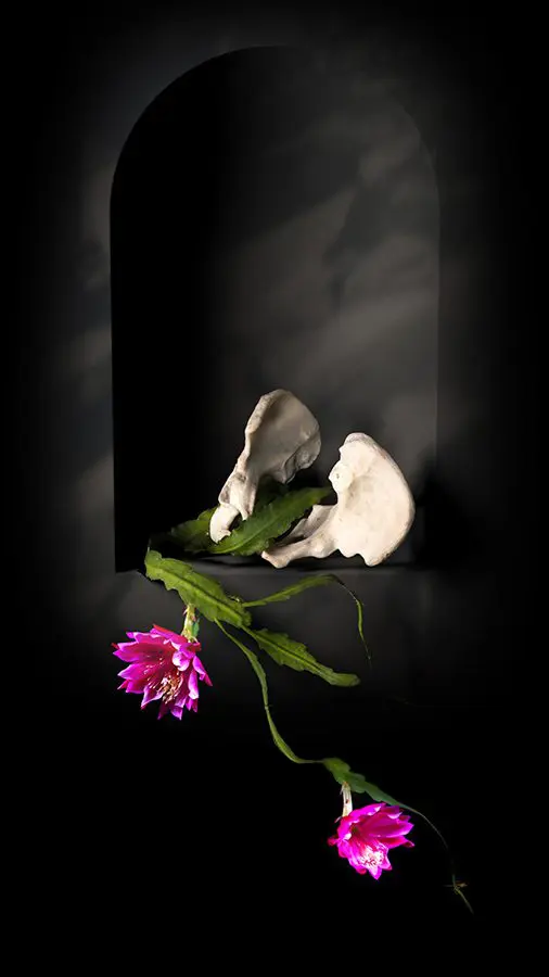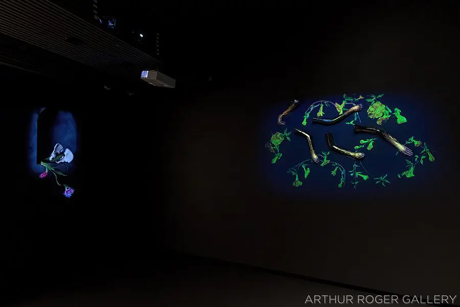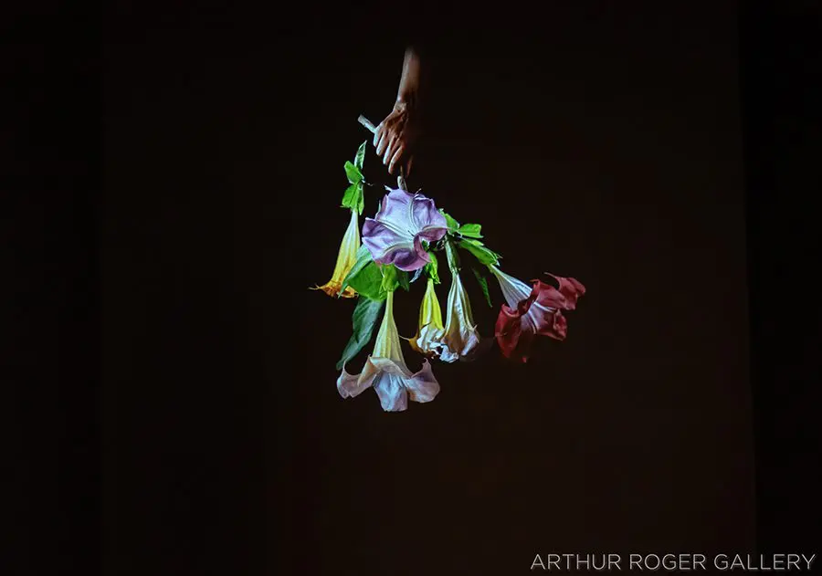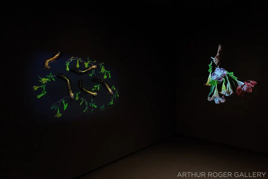 Extinct in the Wild is Courtney Egan’s fourth exhibition with the gallery. The installation features multiple distinct projection-based works that meld technology with nature. Egan creates time-lapse botanical still-life work by taking a series of photographs that are compiled into films and composited with physical elements. With this process, she can create “impossible arrangements.”