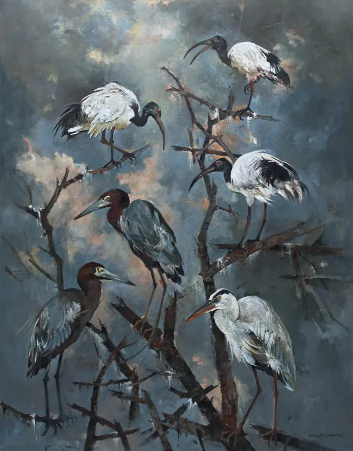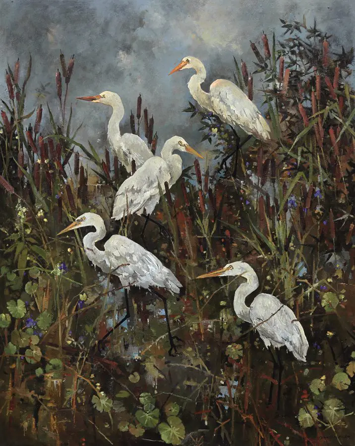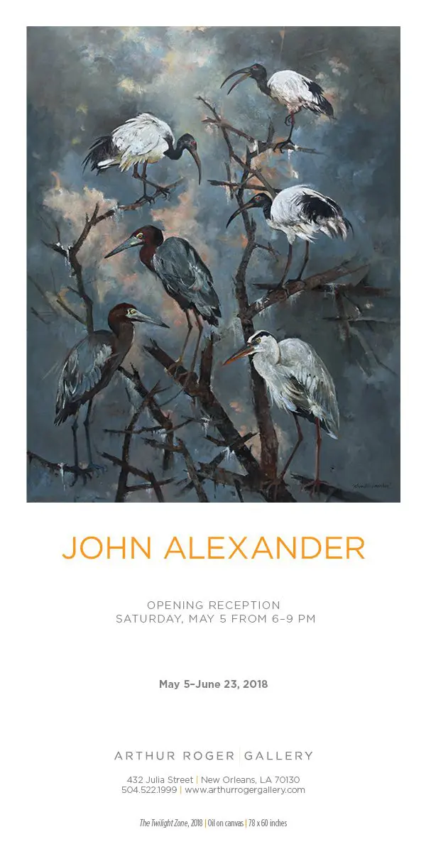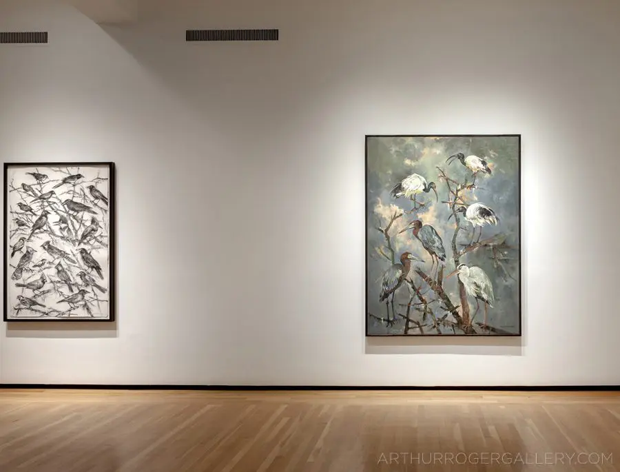 In this exhibition of paintings and drawings, John Alexander shows how his style has progressed and improved in his career spanning over 50 years. Alexander’s floral, bird, and satirical work goes beyond a traditional landscape or wildlife painter. His work is permeated with an uncertainty and partially ominous feeling rooted in man’s encroachment and destruction of the environment.