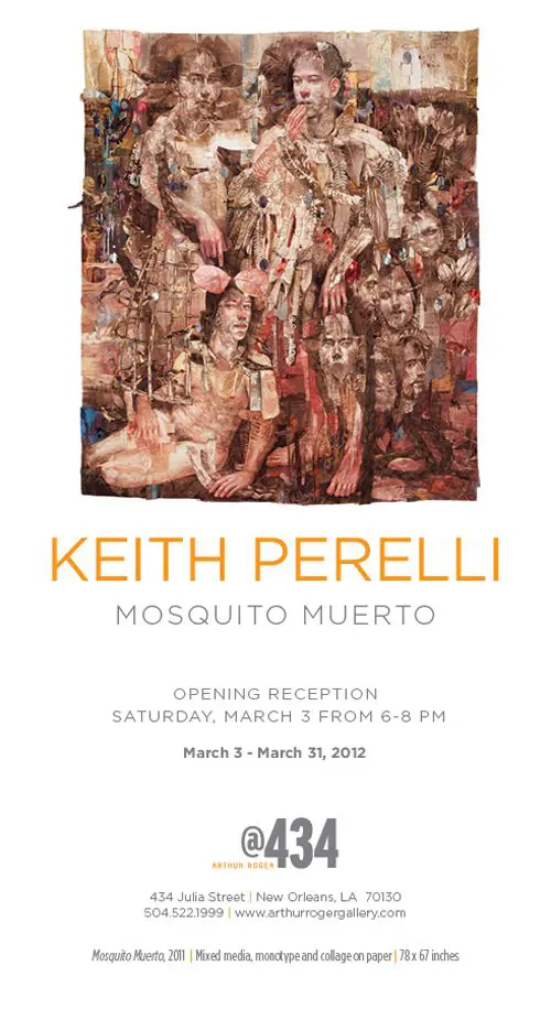 In “Mosquito Muerto” Keith Perelli seeks to expose our emotional defenses as a penetrable, raw façade of our psychological armor. The figures, painted as though from the inside out, have been rendered as stripped and dissected. They are woven into environments composed of tangles of flora, objects of antiquity and illusory abstraction.