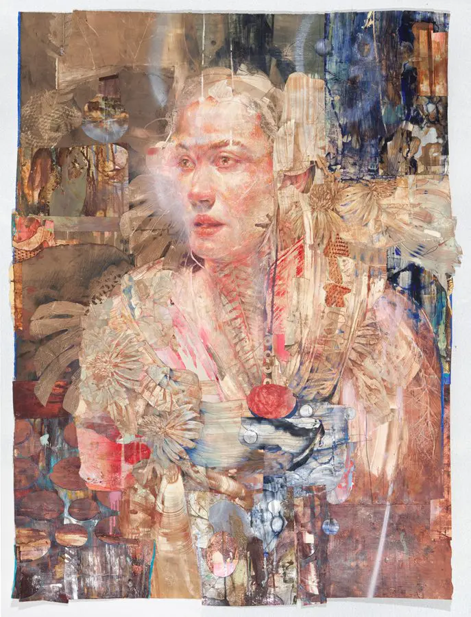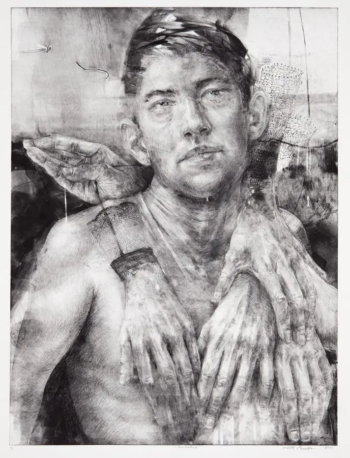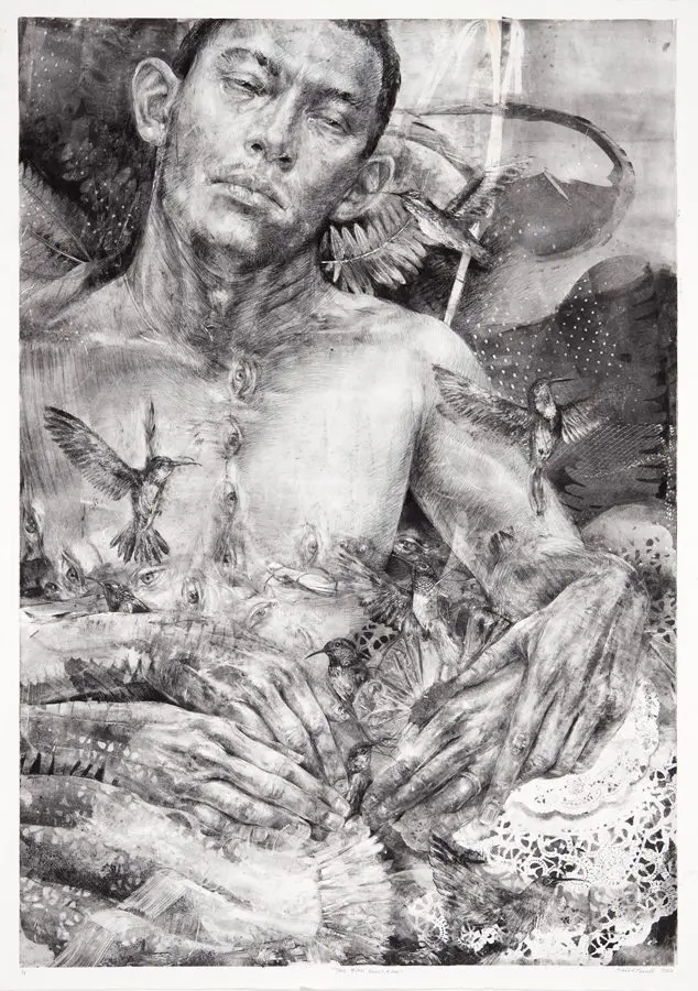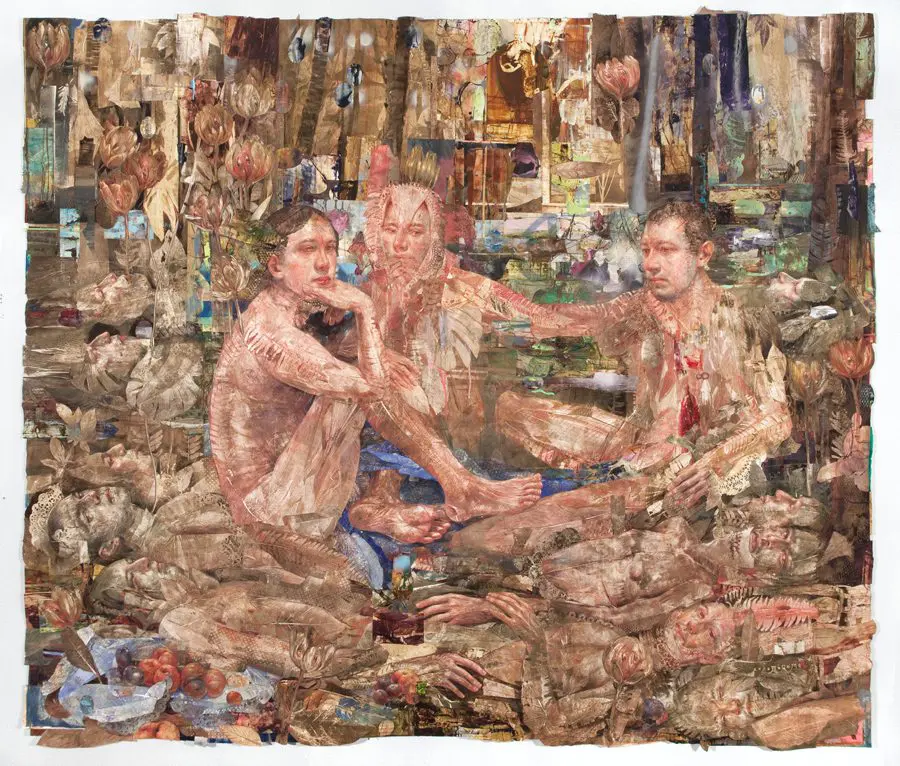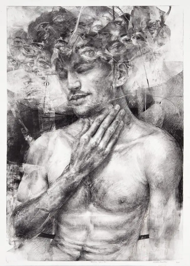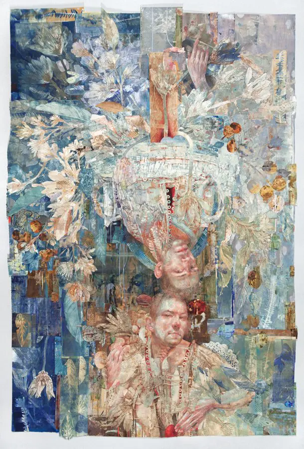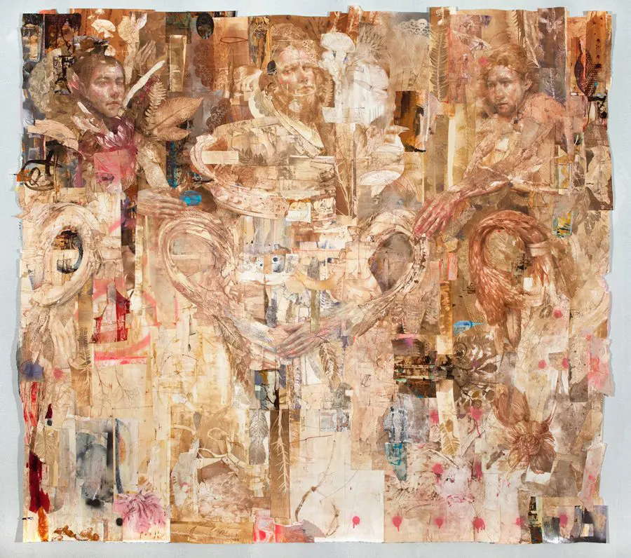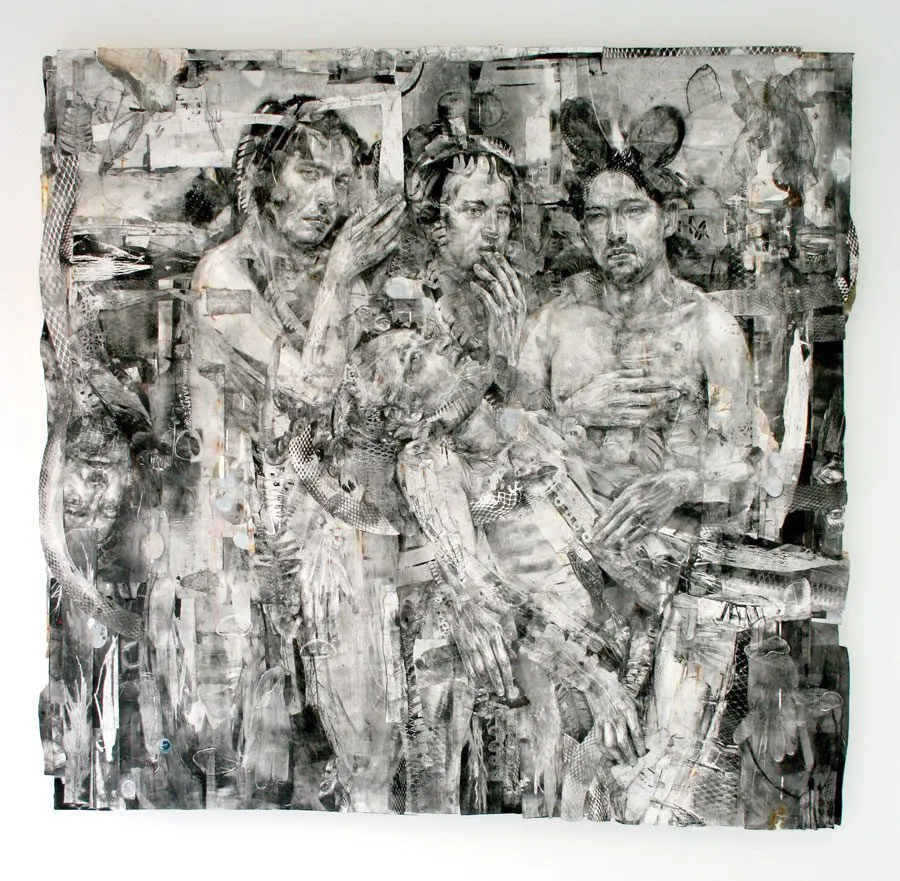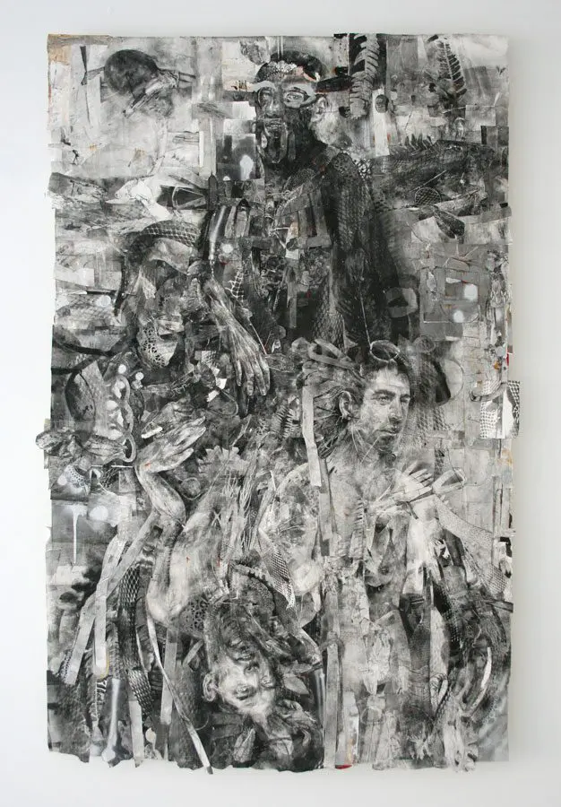 The free hanging tapestry-like quality of the large-scale monotype collage paintings evokes the woven narrative-works produced in the mid-centuries. References to the art form and to antiquity can be noted in the poses and interaction of the figures. Suggestions of religious, mythological imagery and classic hunting scenes are present, although here the artist illustrates man being hunted by his own demons.