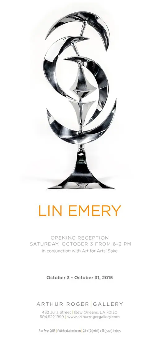 The Arthur Roger Gallery is pleased to present an exhibition of sculpture by Lin Emery. The exhibition will be on view at Arthur Roger Gallery, located at 432 Julia Street, from October 3 – November 28, 2015. The gallery will host an opening reception, with the artist in attendance, Saturday, October 3 from 6-9 pm in conjunction with Art for Arts’ Sake.