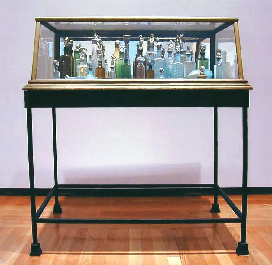 The exhibit is distilled from Mitchell Gaudet’s collection of found objects and includes an antique display case filled with a collection of old bottles, circa 1850-1950, that were dug in New Orleans. Each bottle is sealed with a pewter designed stopper molded from found objects. Gaudet’s exhibit will also include small figurines presented on pedestals and constructed from broken remains collected by the artist. The reinterpreted figurines are redesigned with pewter and bronze components.