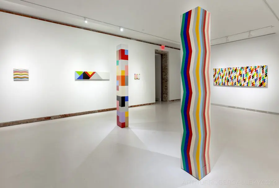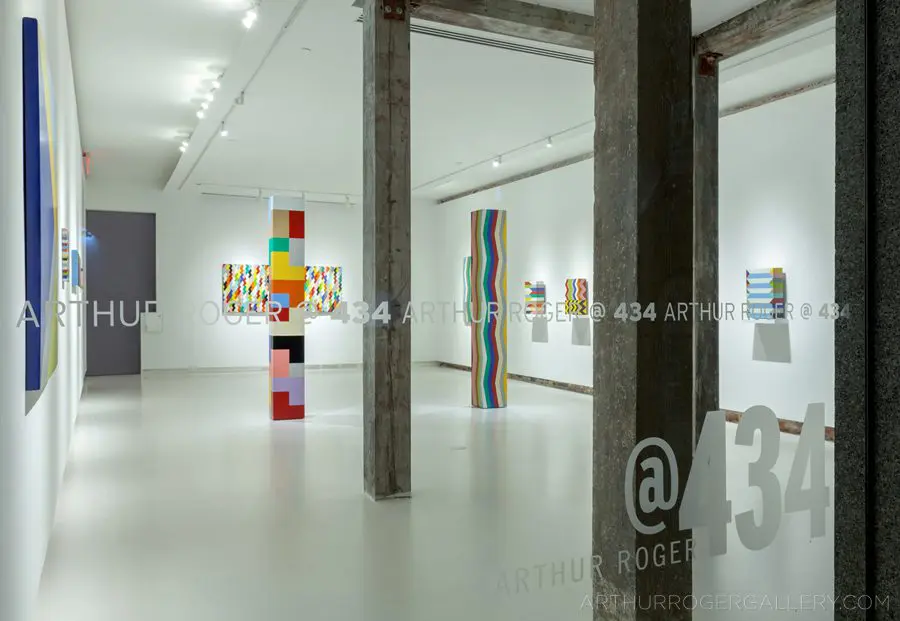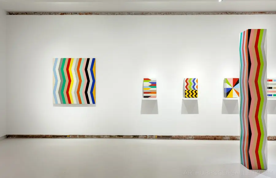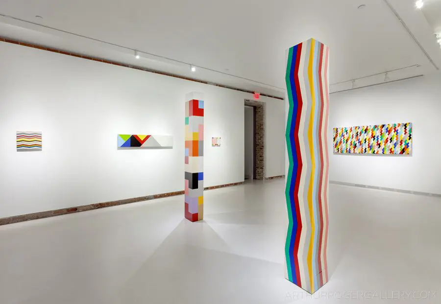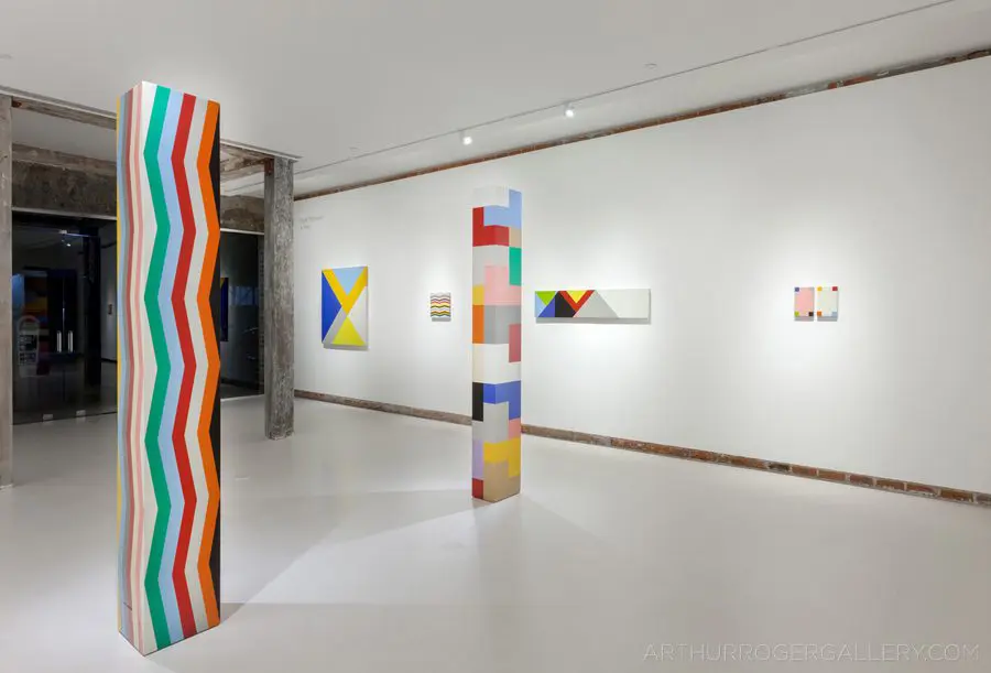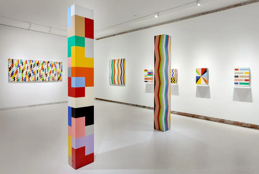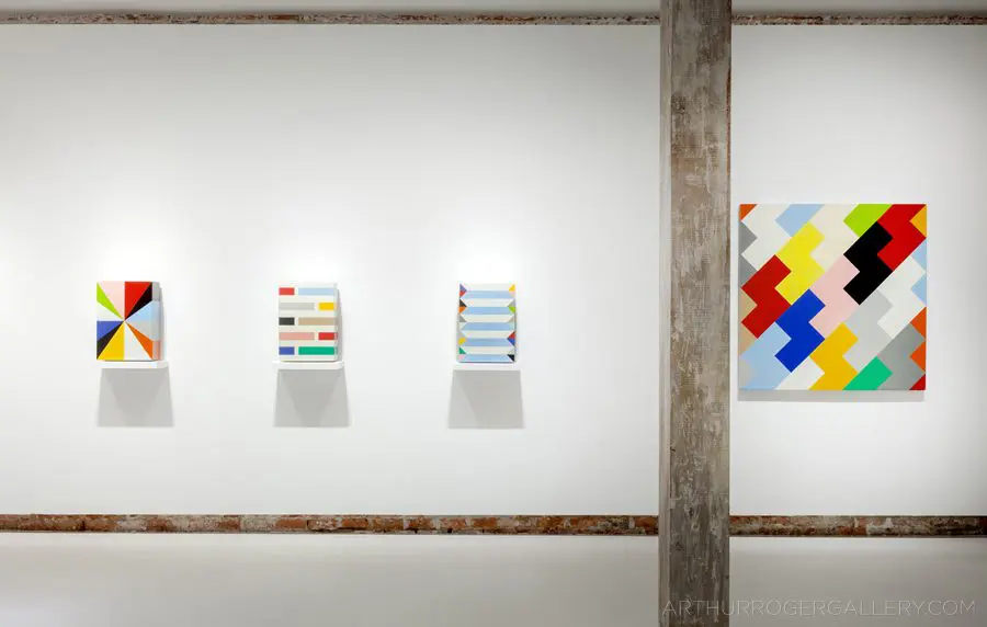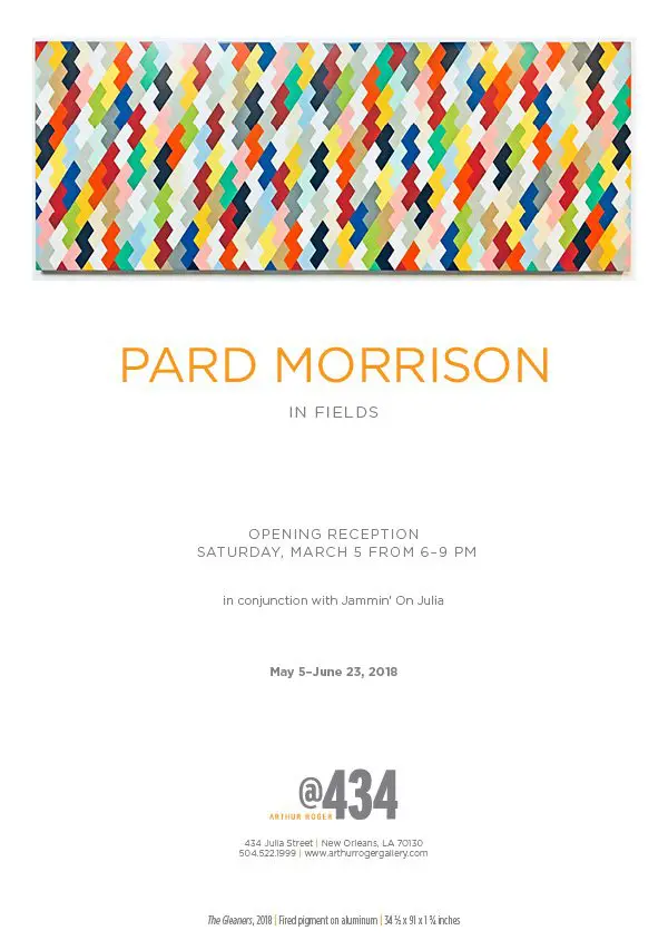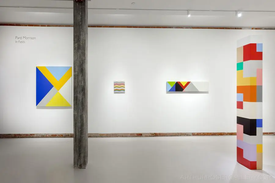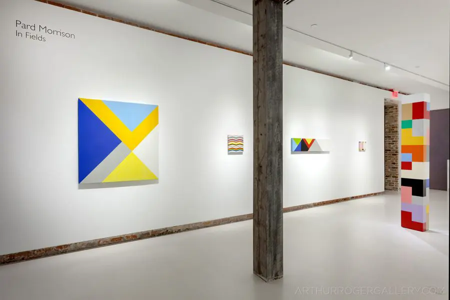 In Fields is Pard Morrison’s fifth exhibition at the Arthur Roger Gallery. Morrison’s work is both sculptural and painterly. Morrison constructs each labor-intensive piece by hand, welding the aluminum structure and firing each color of pigment separately in a process the artist describes as “patination”. His distinct patterns in vibrant reds, blues, greens, yellows, along with more muted earth tones come together to create each distinct piece. The large-scale pieces use color blocks that give the illusion of greater depth.