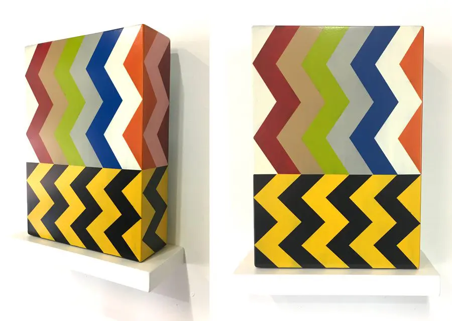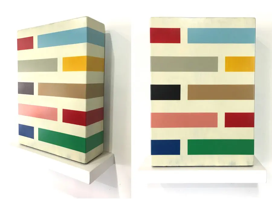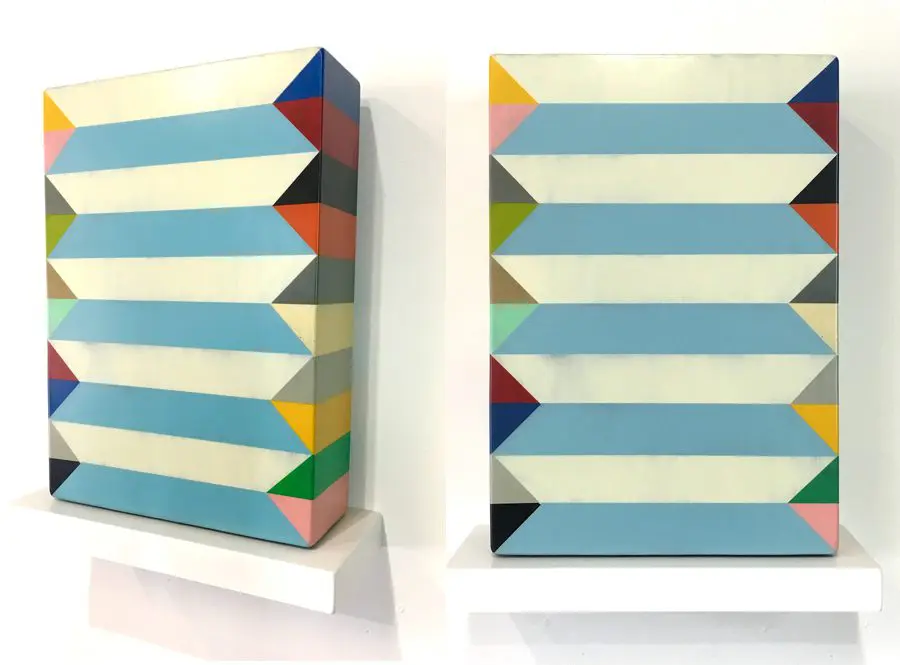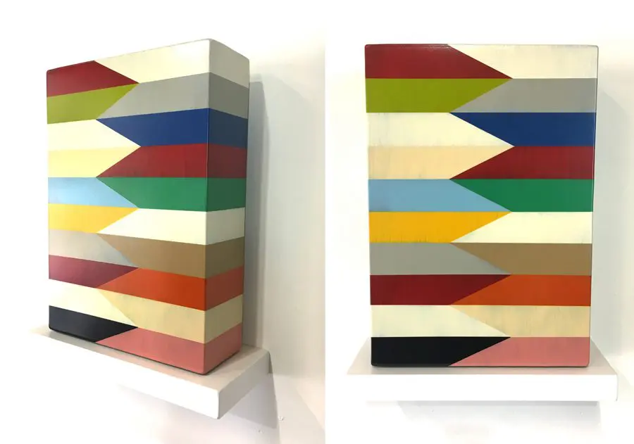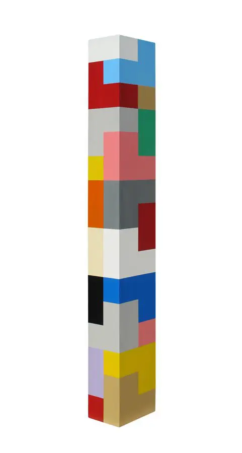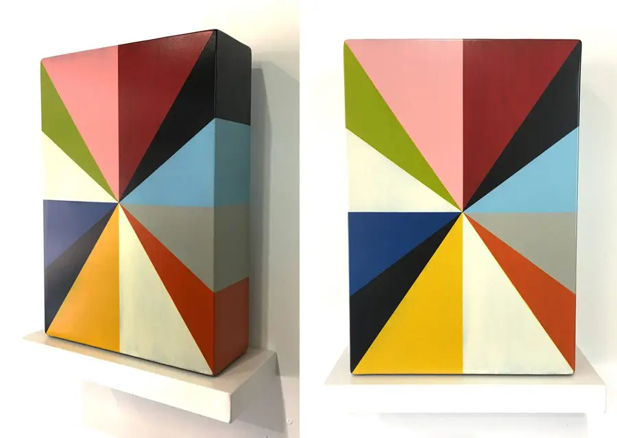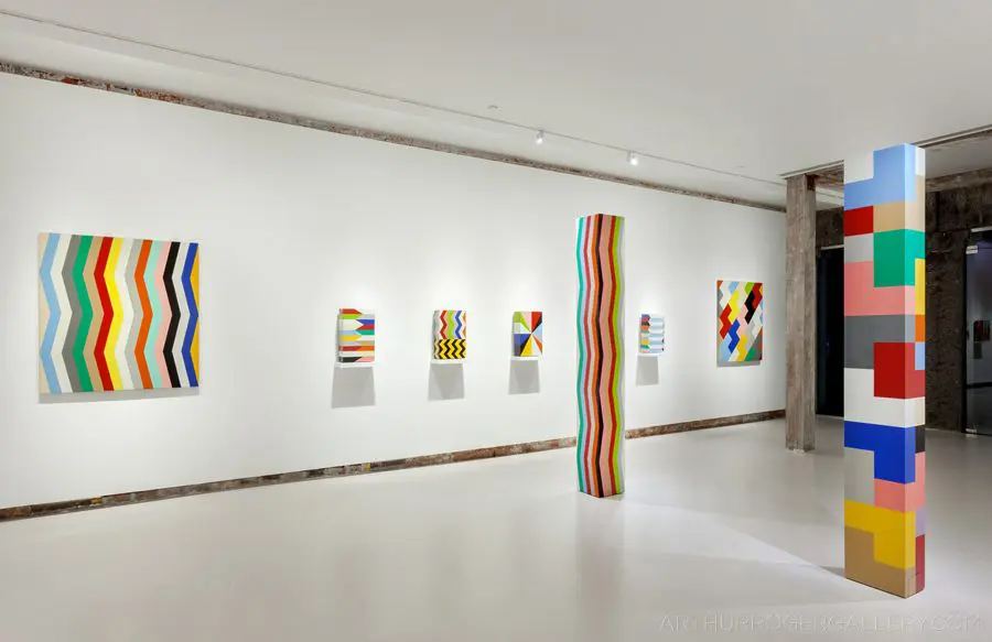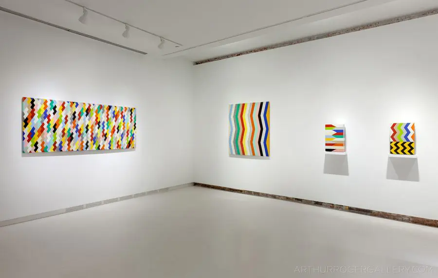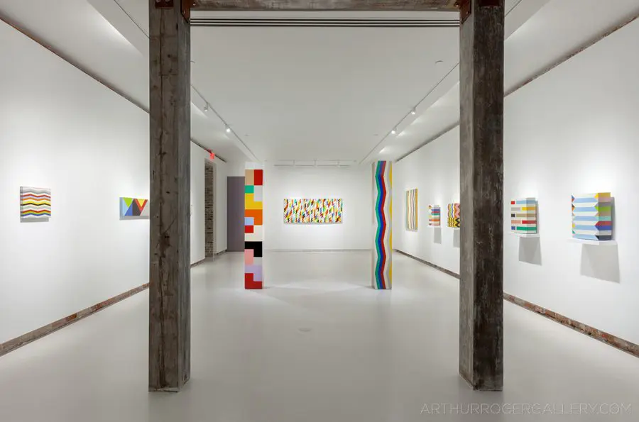 In Fields is Pard Morrison’s fifth exhibition at the Arthur Roger Gallery. Morrison’s work is both sculptural and painterly. Morrison constructs each labor-intensive piece by hand, welding the aluminum structure and firing each color of pigment separately in a process the artist describes as “patination”. His distinct patterns in vibrant reds, blues, greens, yellows, along with more muted earth tones come together to create each distinct piece. The large-scale pieces use color blocks that give the illusion of greater depth.