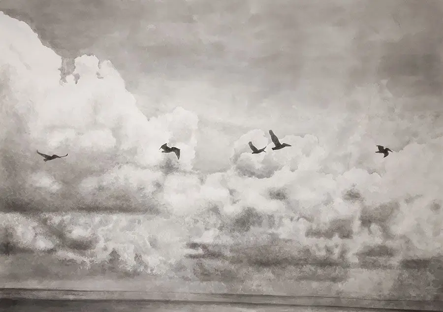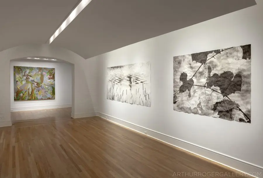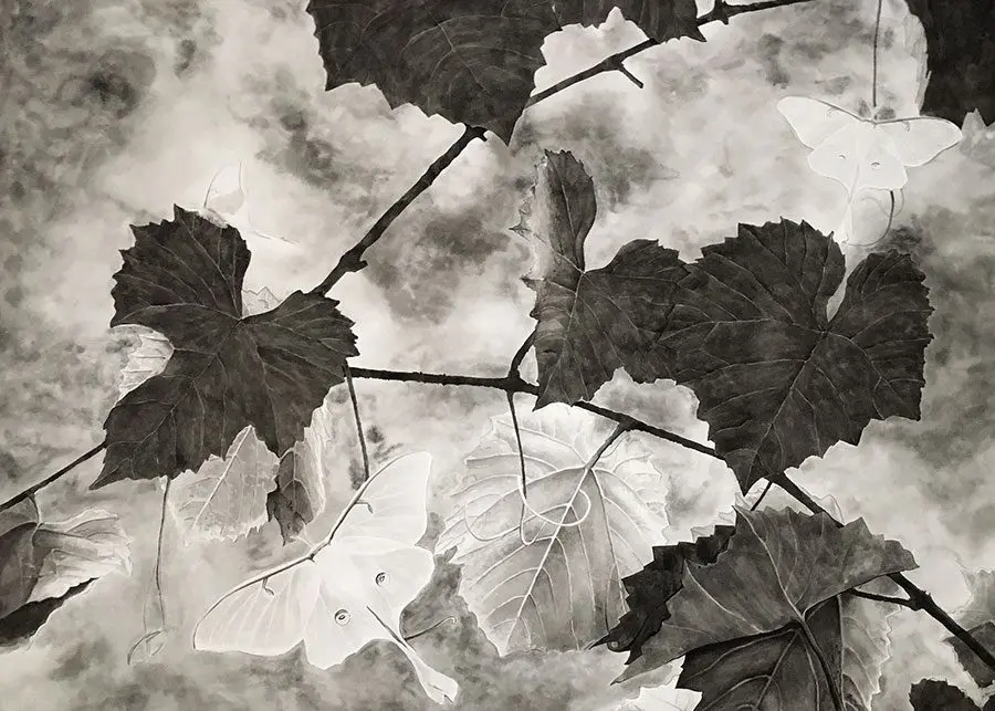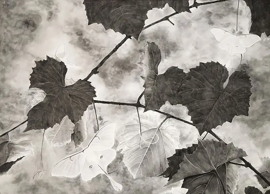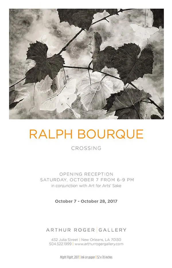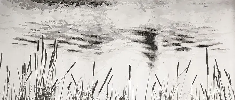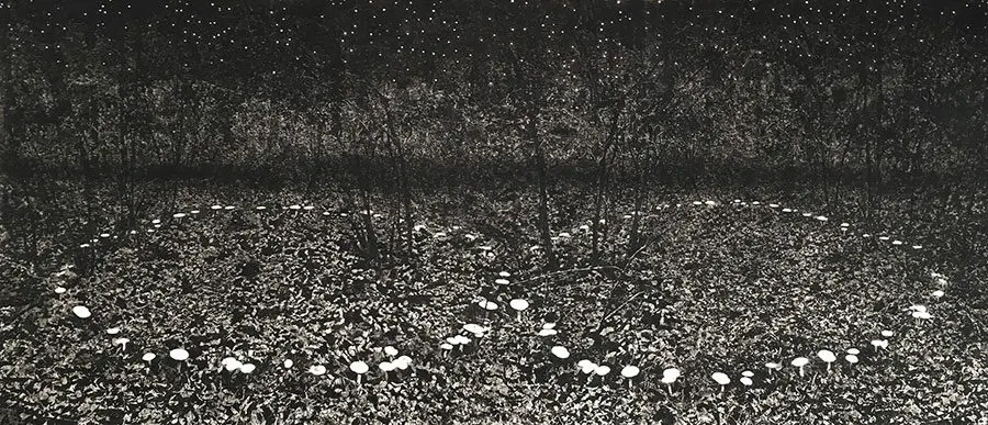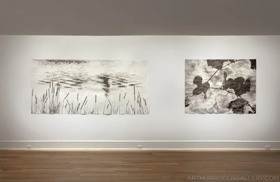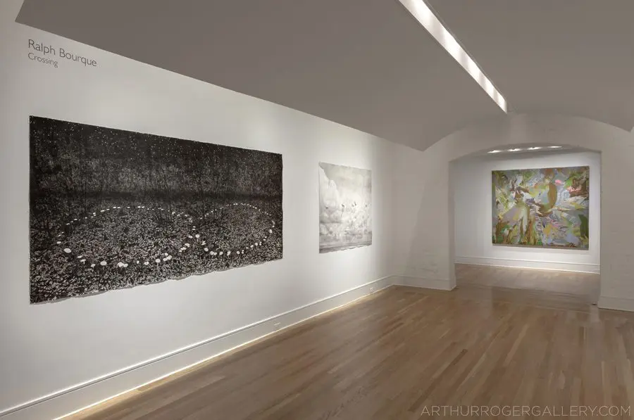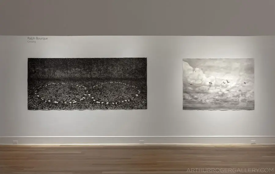 Ralph Bourque’s meticulous landscape chronicles represent the passing of a day – loosely referencing dawn, noon, dusk and midnight, which the artist likens to the cycle of artistic creation. The medium of black ink on white paper allows Bourque to explore the interplay of darkness and light, and he often adjusts the value of the foreground, middle ground, and background of his works resulting in the interchangeability of positive and negative spaces, and thus, unexpected visual outcomes.