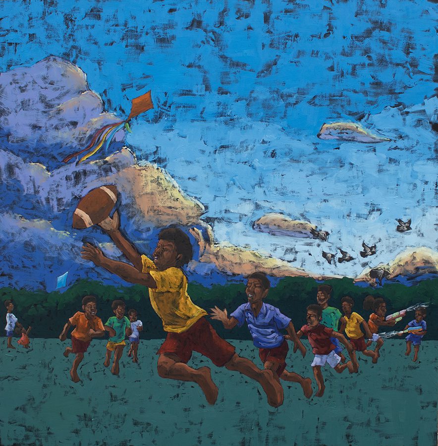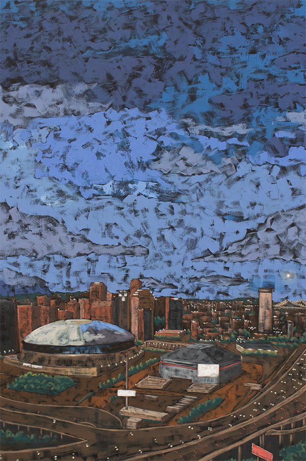 Surtain’s series is “rooted in memory, joy, and community,” honoring pre-Katrina New Orleans, “when the city felt like one big front porch.” His vividly composed canvases—children diving for a football, laughing through water gun fights, makeshift parades—evoke the rhythms and bonds that shaped his Mid-City childhood. Works such as the new Superdome cityscape anchor the show, preserving both the architecture and spirit of the neighborhoods that defined him.