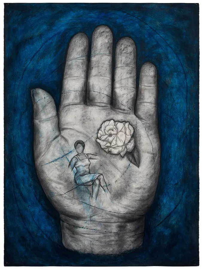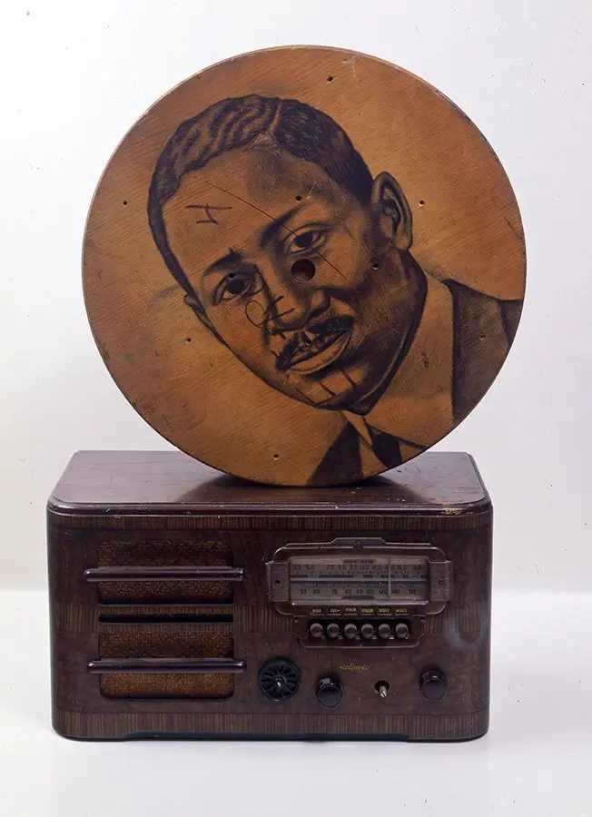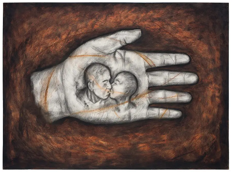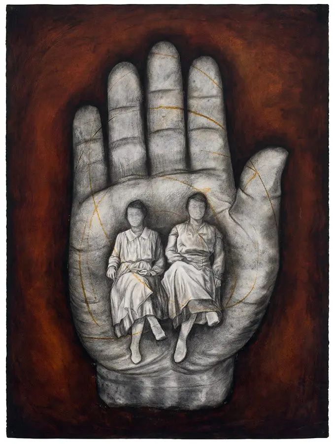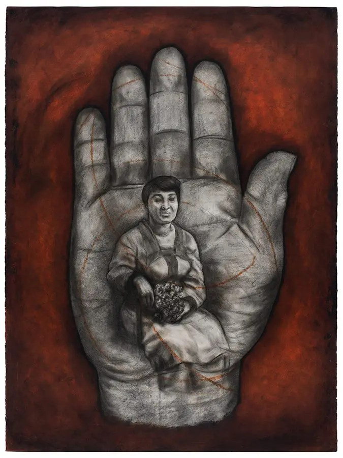 The large-scale hand drawings are excellent early examples of Whitfield Lovell’s combining of iconic imagery and portraiture. The artist first created large-scale drawings in charcoal and oil stick during his Skowhegan residency in 1985. The series included in Whitfield Lovell: Marks in Time were created in 1995 and 1996 when he received a prestigious grant from the Joan Mitchell Foundation. Lovell states, “I began collecting hands after I had already been using hands in my work. The more I learned about the iconography of hands, the more excited I was to continue with the theme. Also, my interest in collecting crayon portraits came simultaneously with the images in the Hand Series, though I didn’t consciously think about it at the time … There has always been a reason for my wanting to own certain objects more than others. I’ve tried to be a focused collector so that I was spending my money on things that fed the work.” Lovell is an avid collector of village photographs, especially phtogpgraphs depeicing Black subjects.
